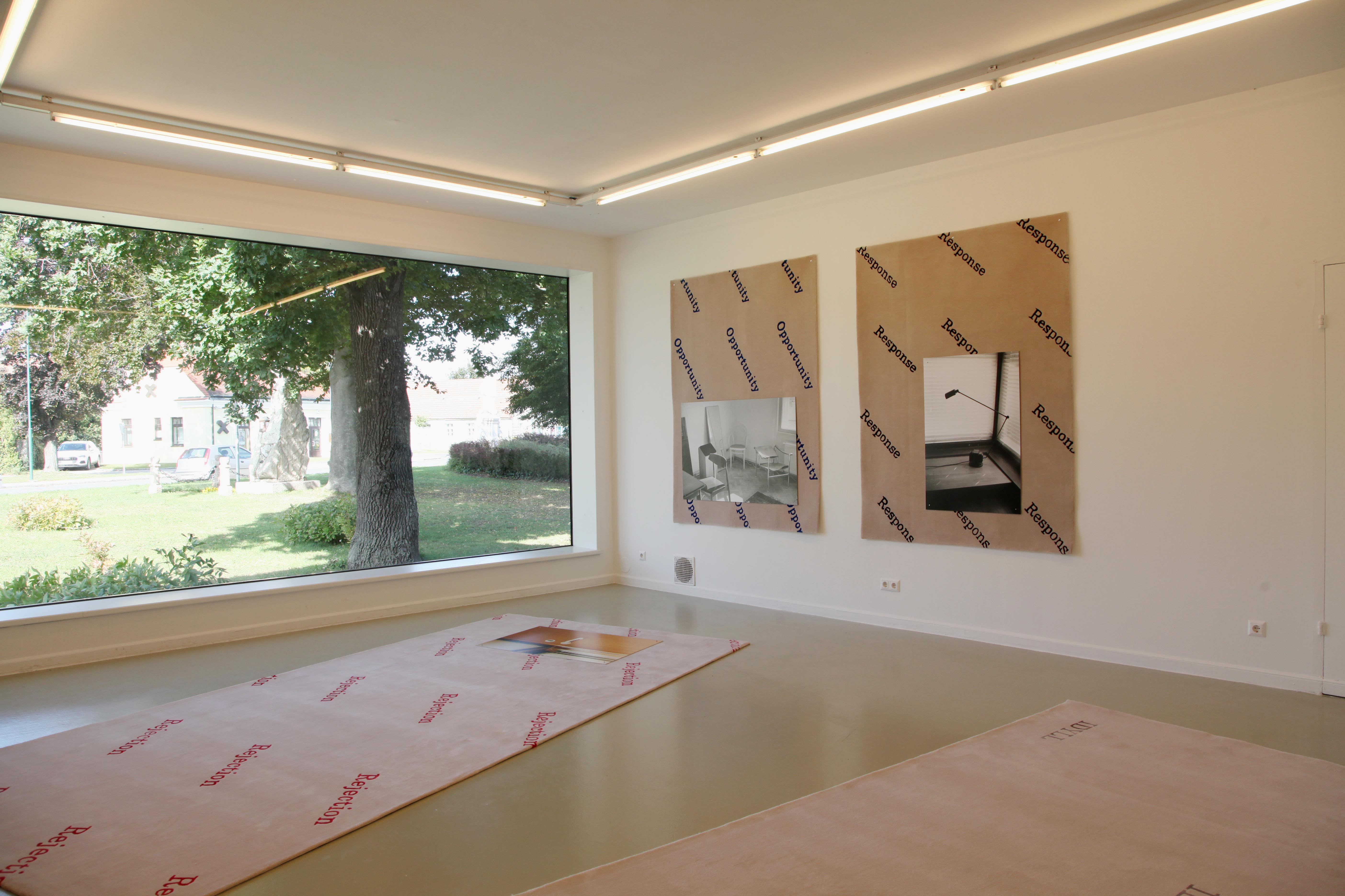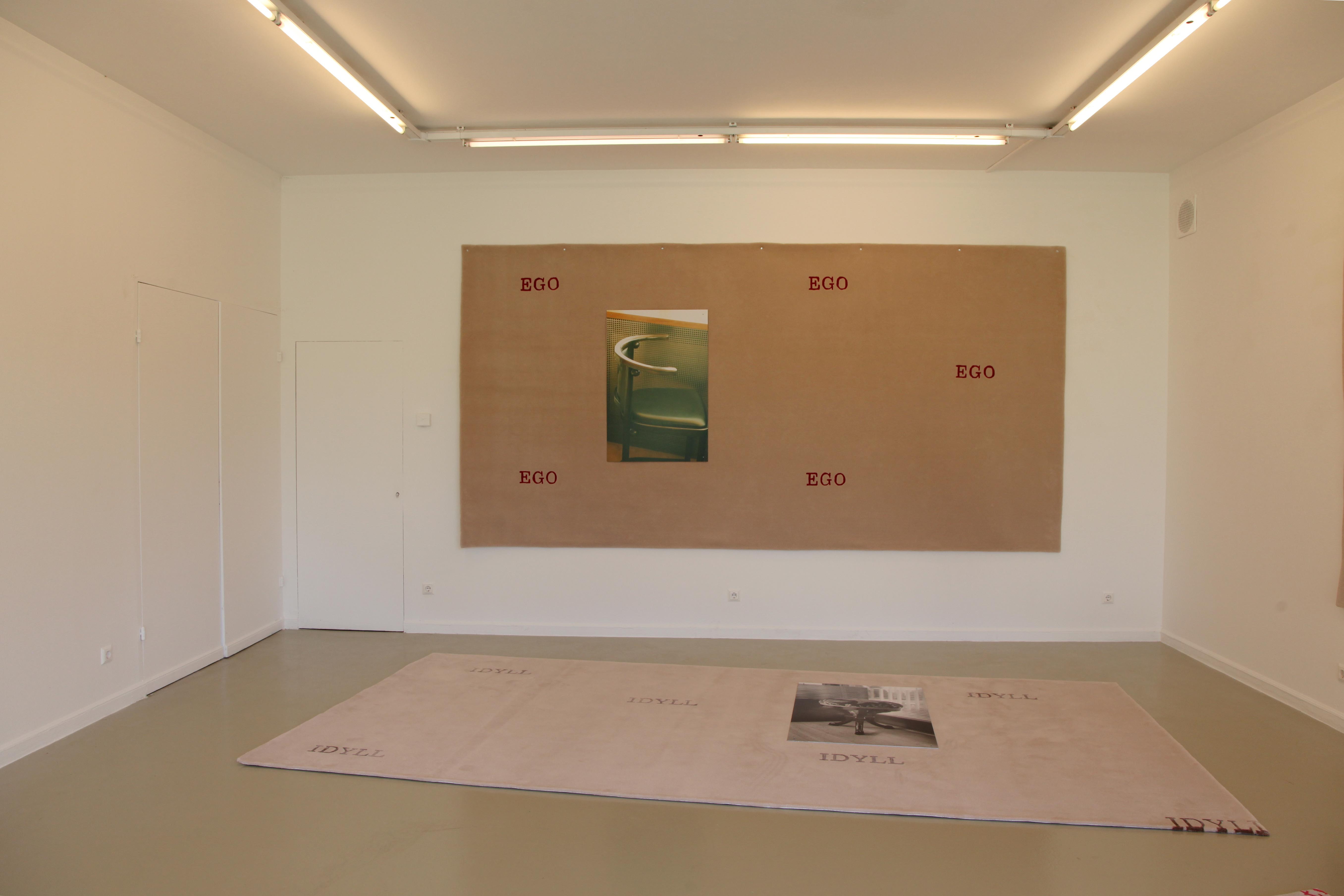 Rugs in different sizes made to fit the dimensions of the exhibition space filled the room, reflecting the situation and covering the floor and walls as carpets and tapestries.(1) Each work seemed like A Room of One´s Own, hinting at the importance of having a separate space in the private realm that makes us feel secure and lets us open up in the first place.(2) The photographs revealed everyday objects, apparently in interiors, making it seem as if viewers were looking through the abstracting zoom of a camera lens into someone else’s life. Their gaze penetrated deep into another interior, in a way creating a doubling effect of the window through which the inside of the Kunstraum is visible. The terms Fear, Ego, Opportunity, Idyll, and Response were inscribed as emotional links on the rugs, referring to the intimacy of inner experience and describing subjective emotional states. Through the typography of the words, a textual ornament, even a mesh of social states and conditions, was created.(3) The nexus between the written words and the images was the connection between a you and a me—a network of relationships that intertwined like threads of fabric moving toward an us.