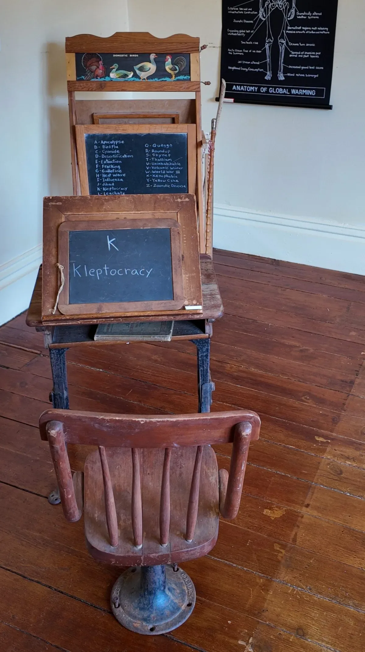 Around the corner from the Collections Room is a child’s bedroom. Mark Dion has transformed this space into a nursery classroom populated by blackboards, didactic charts, and infographics. While this type of chart was a familiar teaching tool in the 19th century, these new works by Dion have a less than straightforward relationship to information. Many of the works offer satirical commentary about our current culture of corruption and power. The traditional form has been hijacked to provide a critical perspective on systems of knowledge production and the apparatus of “truth.”