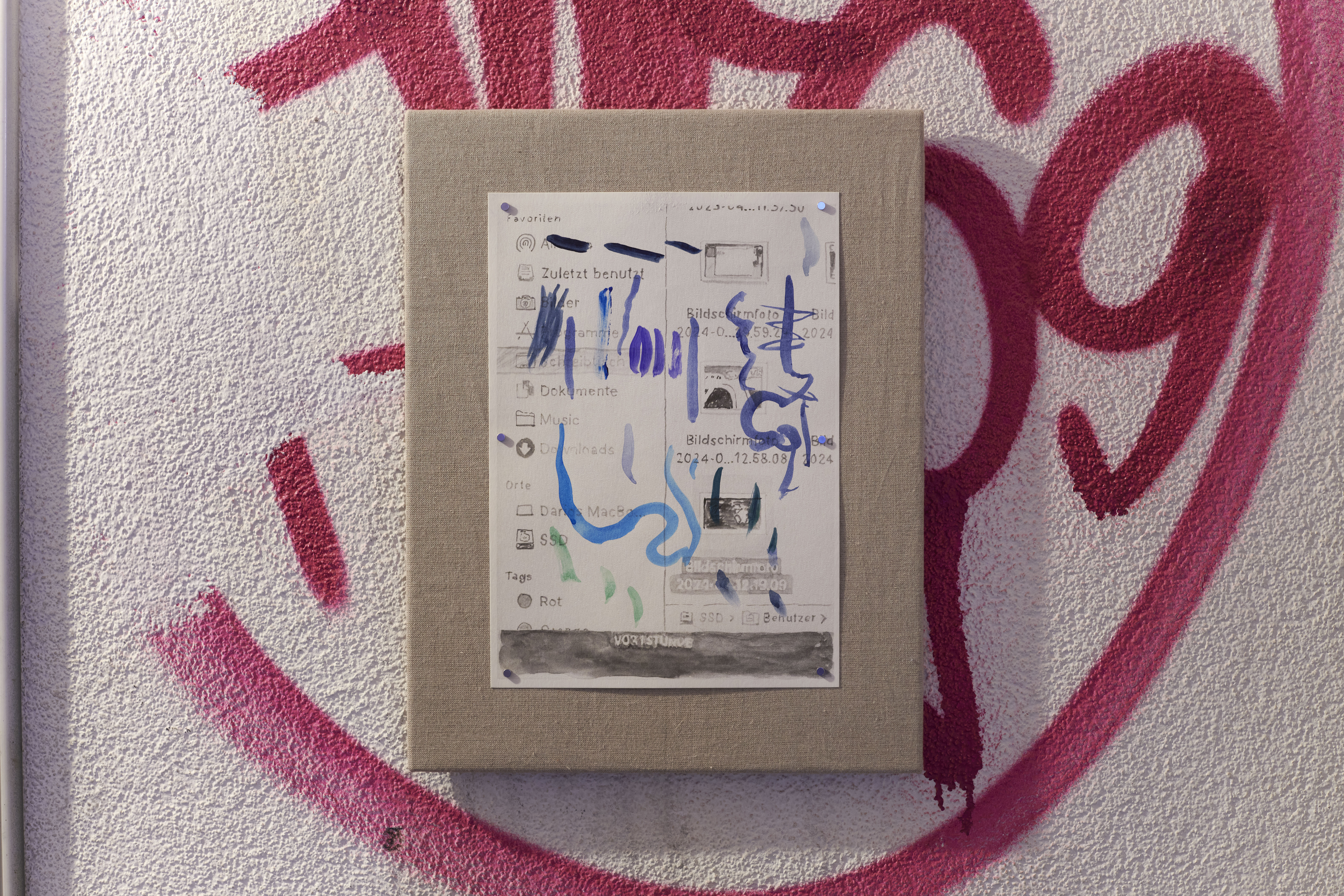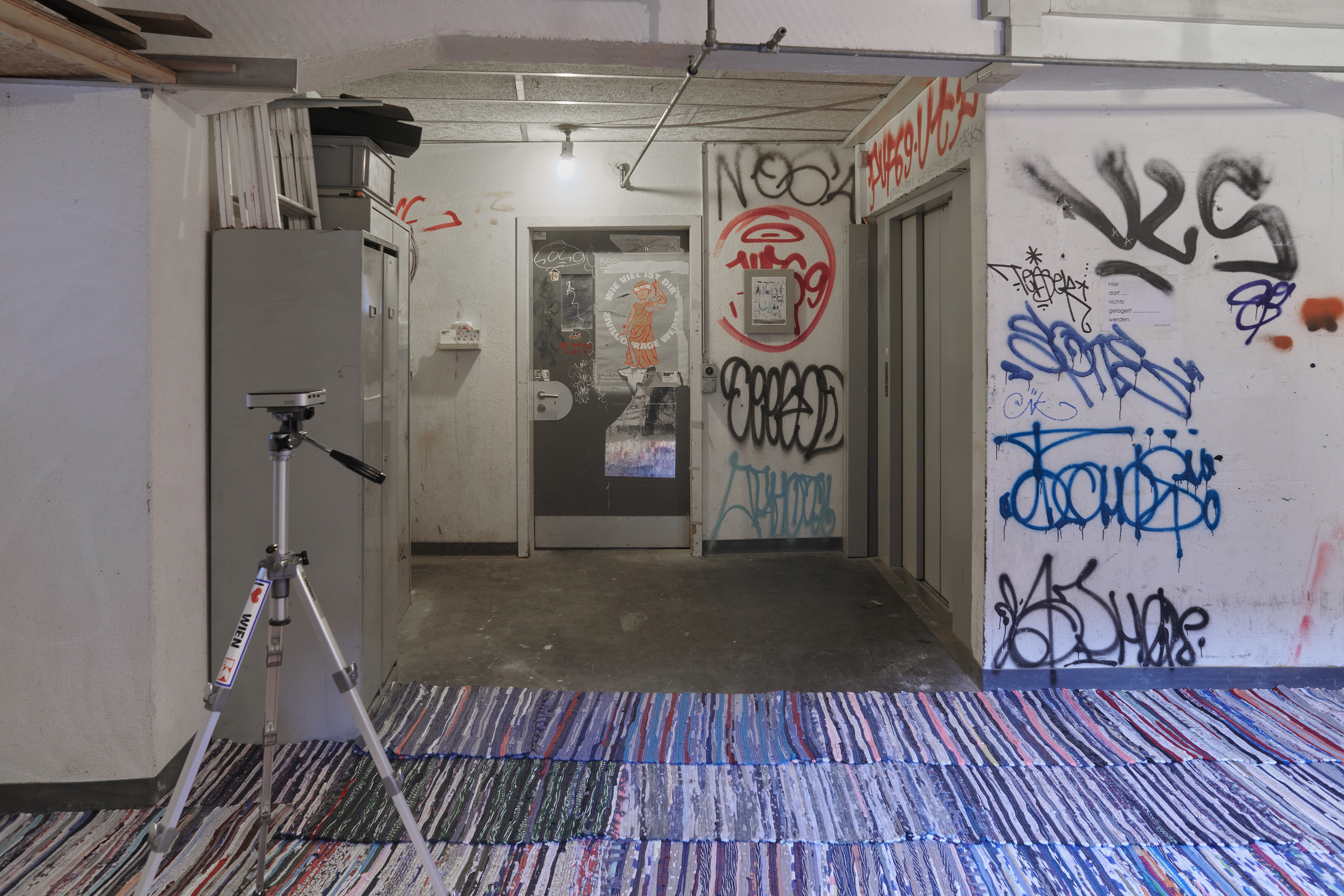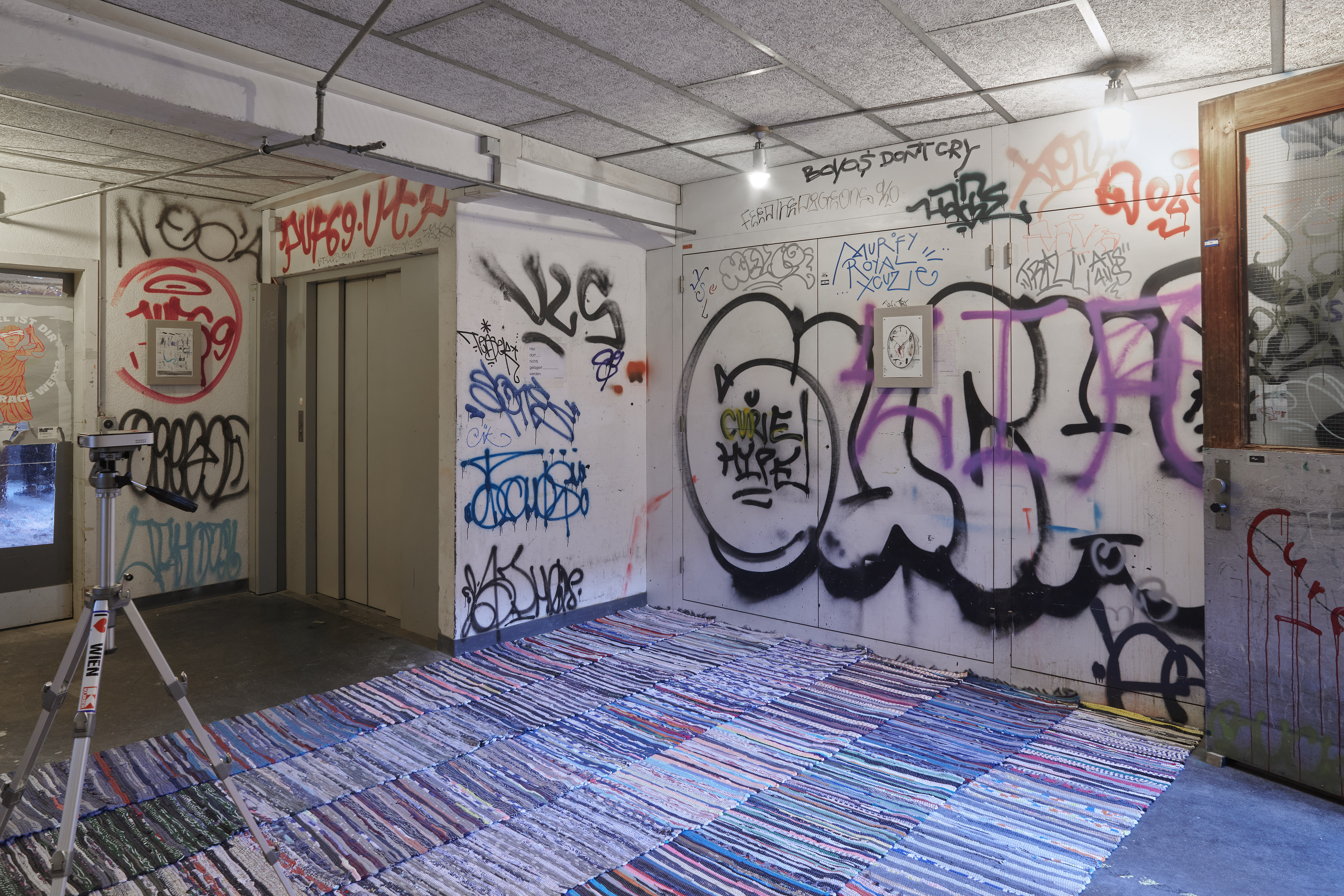 A flat plinth made of rag rugs on the floor, watercolours as slides and their translations into originals on the wall. Wokurka renders these watercolours in a persistently casual manner, thus creating the visualization of a quasi-algorithm that appears incalculable from an outside perspective. A slideshow that through its surprising and its redundant moments both rewards and frustrates our viewing habits and expectations regarding pictures.