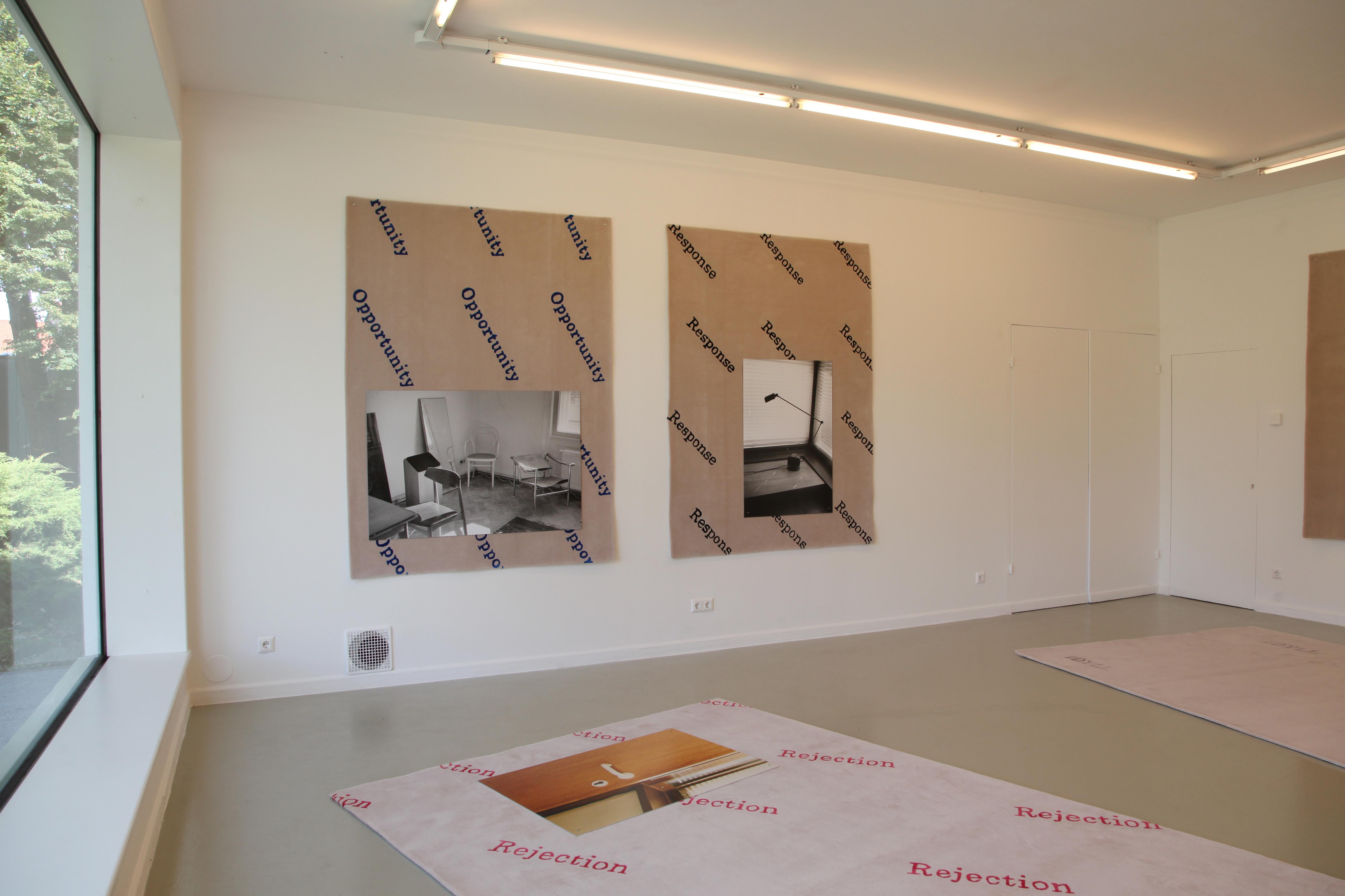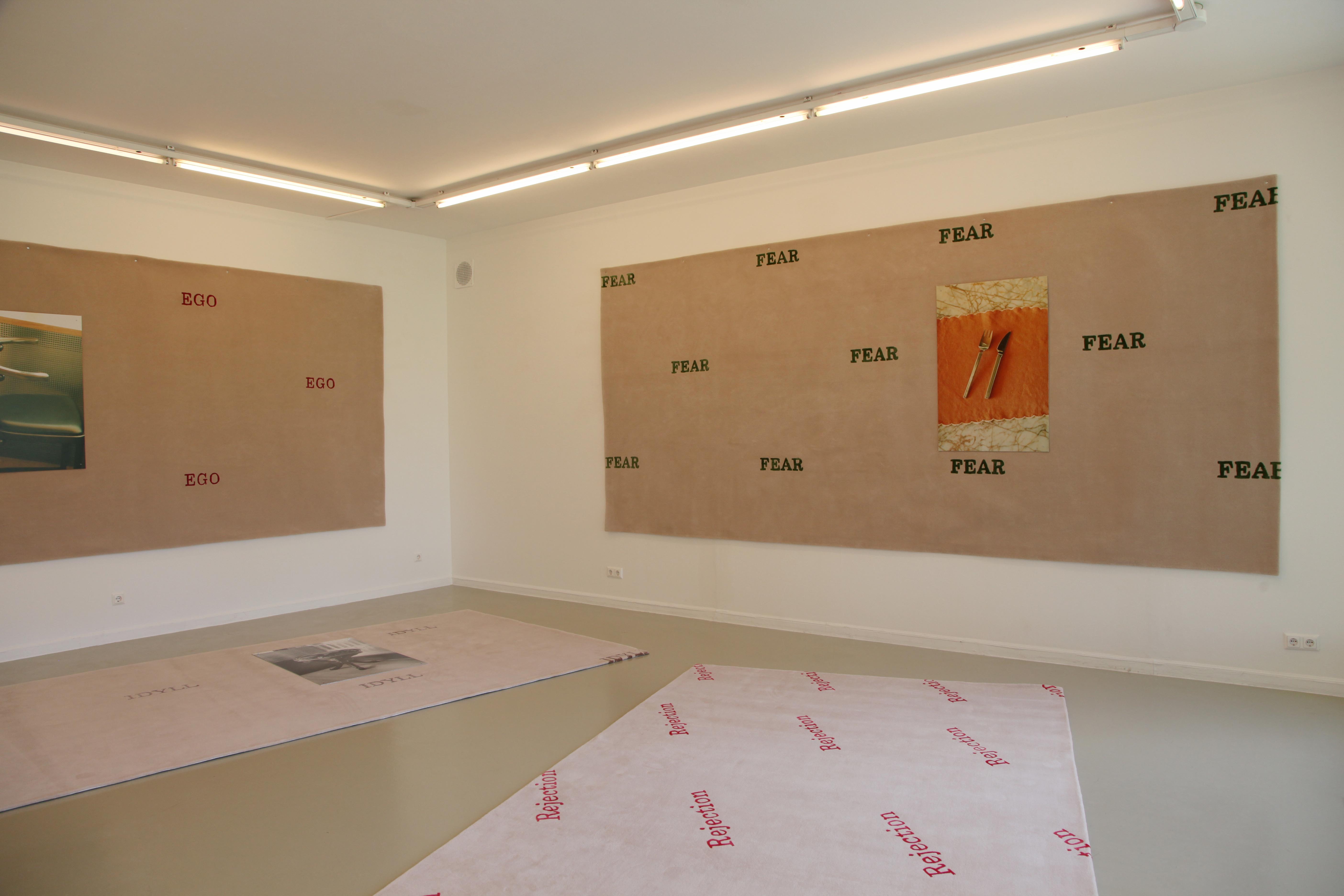 In dieser Ausstellung nehmen die Formate der Teppiche die Dimensionen des Raumes auf, spiegeln die Verhältnisse wider, werden zum Bodenläufer oder bekleiden (1) an Tapisserien erinnernd die Wand. Dabei wirkt jede Arbeit wie ein Zimmer für sich, A Room of One´s Own (2) deutet die Wichtigkeit eines geschlossenen Bereichs im Privaten an, in dessen Sicherheit ein Sich-Öffnen erst möglich wird. Wir sehen auf den Fotos interieurartige Objekte des Alltags abgebildet, blicken quasi durch die abstrahierende Vergrößerung einer Kameralinse in das Leben eines Gegenübers. Fast wie eine Verdoppelung des Fensters, das uns von außen in das Innere des Kunstraums sehen lässt, dringt unser Blick hier in einen weiteren Innenraum vor. Diese Intimität des inneren Erlebens nehmen auch die Begriffe Fear, Ego, Opportunity, Idyll und Response auf. Die einzelnen Wörter beschreiben jeweils subjektive Gefühlszustände und schreiben sich wie emotionale Anknüpfungspunkte in den Teppich ein. Aus dem Schriftbild der Begriffe ergibt sich ein textuelles (3) Ornament; ein Gewebe an sozialen Zuständen und Umständen. Der Nexus zwischen Text und Abbildung ist die Verknüpfung von einem Ich und einem Du. Ein Beziehungsgeflecht, das sich wie die Verkettung der Fäden zu einem Gewebe in Richtung eines Wirs verwebt.