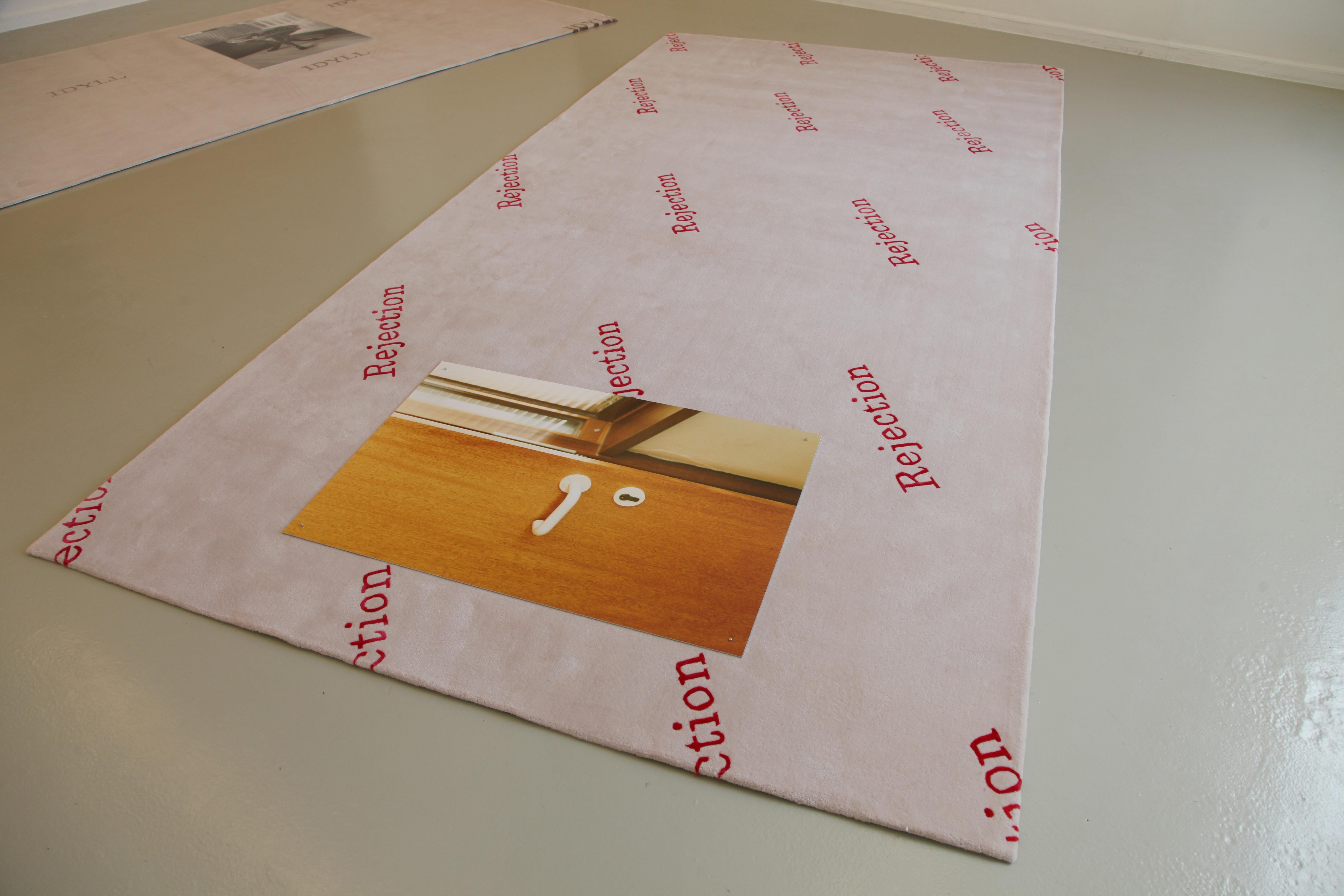 Rejection – eine Zurückweisung, sprich abgelehnt zu werden oder eine Absage zu erteilen. Also eine passive oder aktive Position innehaben? Die Abweisung als (vorweggenommene) Reaktion, aus Angst vor einer Abfuhr, ein Moment der Wiederholung – ein Kreislauf beginnt. Diese Choreografie ist dem sozialen Miteinander immanent, sie entsteht zwischen Nähe und Distanz, einem Innen und Außen, einem Selbst und dem Gegenüber. Auch der Teppich versinnbildlicht diesen Dualismus, indem er zwei sich gegenüberliegende Welten auf einer metaphorischen Ebene verhandelt: Wie ein symbolischer Träger verbindet er den privaten Raum durch seine einladende Geste mit einer Öffentlichkeit. Er ist oft weich, lässt sich betreten und auf sich sitzen oder dient der Gemütlichkeit als Komplize im Erzeugen von sozialer Wärme. Seine Farben und Muster haben Bedeutung, neben kulturellen Hintergründen geben sie ästhetische Vorlieben preis.