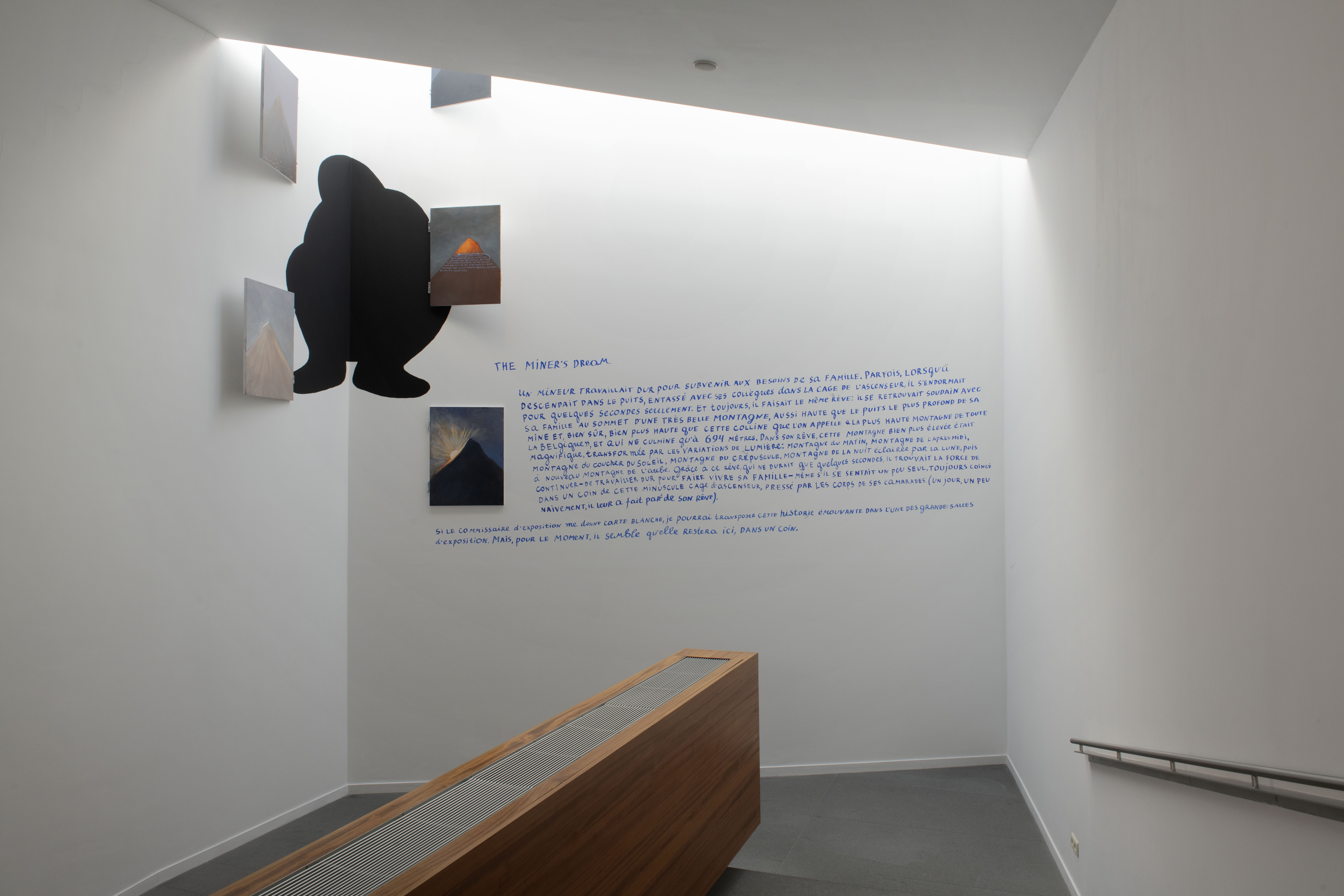 A Cornered Solo Show #6 evokes the reverie of a miner, his contemplative dream at the top of a mountain, surrounded by his family. This daydream provides him with strength to work and feeds his desire for a peaceful, contemplative existence. This figure embodies both the endless cycle of hard labour and the vital dependence on it to ensure the survival of his family. Like Sisyphus, he exhausts himself tirelessly in a repetitive task, the exit from which seems to be constantly postponed, generating an allegory of work as a necessity, a burden and a driving force of hope.