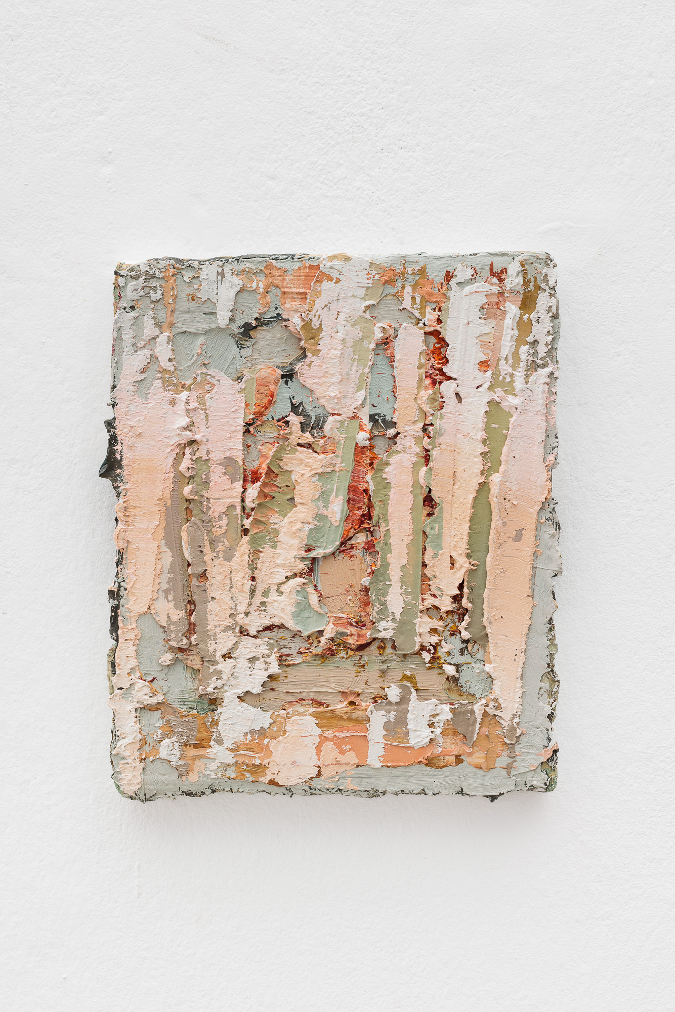 Her works, often originating from a humble gesture, explore materiality in a state between lightness and density developing a dialectic between everyday occurrences and broader structural forces. Along with the interplay of form and formlessness they reflect on processes of change and transience. As Mangrané notes, "In the plasters, I pour everything fragile that still resists submission. In some way, their life is grafted onto mine. There’s a somatism that I pour into the pieces, which helps me channel the intensity of my experiences with the world and its violence.” Works that appear soft and flaccid are, in fact, rigid and hard. Despite a crushed appearance, they retain a pulse of colour that filters through them and lingers. This exploration was sparked during a residency in the French Prealps, where her observation of rockfall containment nets—engineered to absorb kinetic energy—resonated with her artistic inquiry into how surfaces incorporate dynamics of impact.